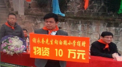 东意眼镜向家乡学校捐赠10万元 满腔热忱为家乡,一颗爱心献母校。前不久,温州东意眼镜厂总经理谢永奎在返乡过节的时候向他的母校遵义县泮水镇白鹤小学捐赠30套电脑和电脑桌等价值10万元的物资。