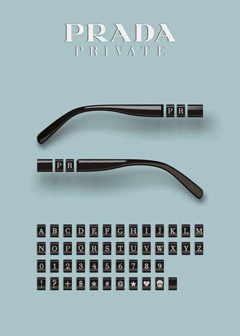 Prada推出了一个Private客制化的镜框单品。当中有三个颜色可供选择:分别是黑、白和玳瑁色,可利用四种不同的材质搭配出16中不同的颜色组合,再加上不同的文字与图案搭配形成专属于自己独特个性的配件,拆卸安装都十分方便容易。