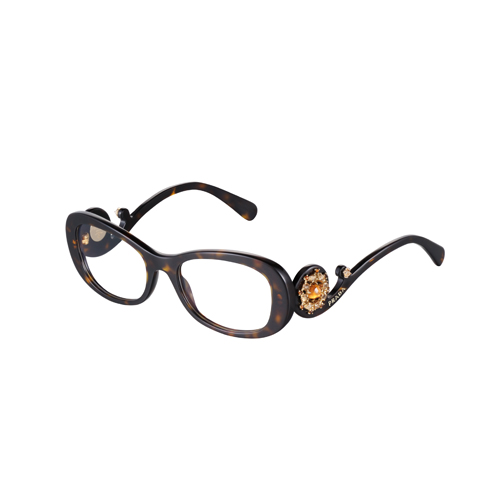 对完美古典主义的风格研究令这款眼镜在精致的线条与醋酸酯前框和镜脚的醒目外观 间找到一个完美平衡。这一款式与众不同的特征是色彩的演变,不同的颜色相互组 合,创造出璀璨夺目的前框。可选颜色有黑色和玳瑁色,搭配芥末色和墨黑色。饰有 Prada 刻印标识。